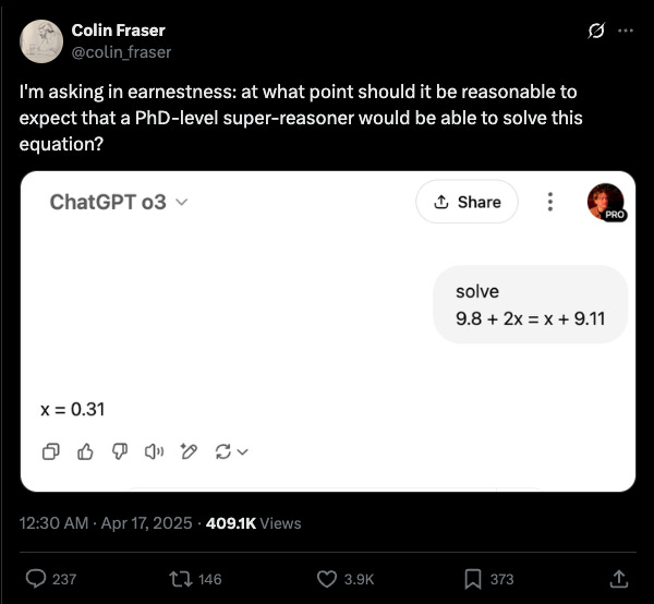When I tried the same prompt, o3 nailed it on the first try, so it seems to be more a matter of missing reliability, rather than a consistent failure, which Fraser also recognizes.